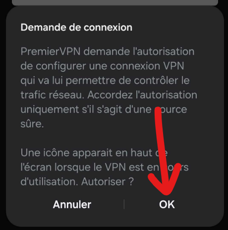 L'Application PremierVPN va demander à votre smartphone l'autorisation d'établir une connexion VPN.